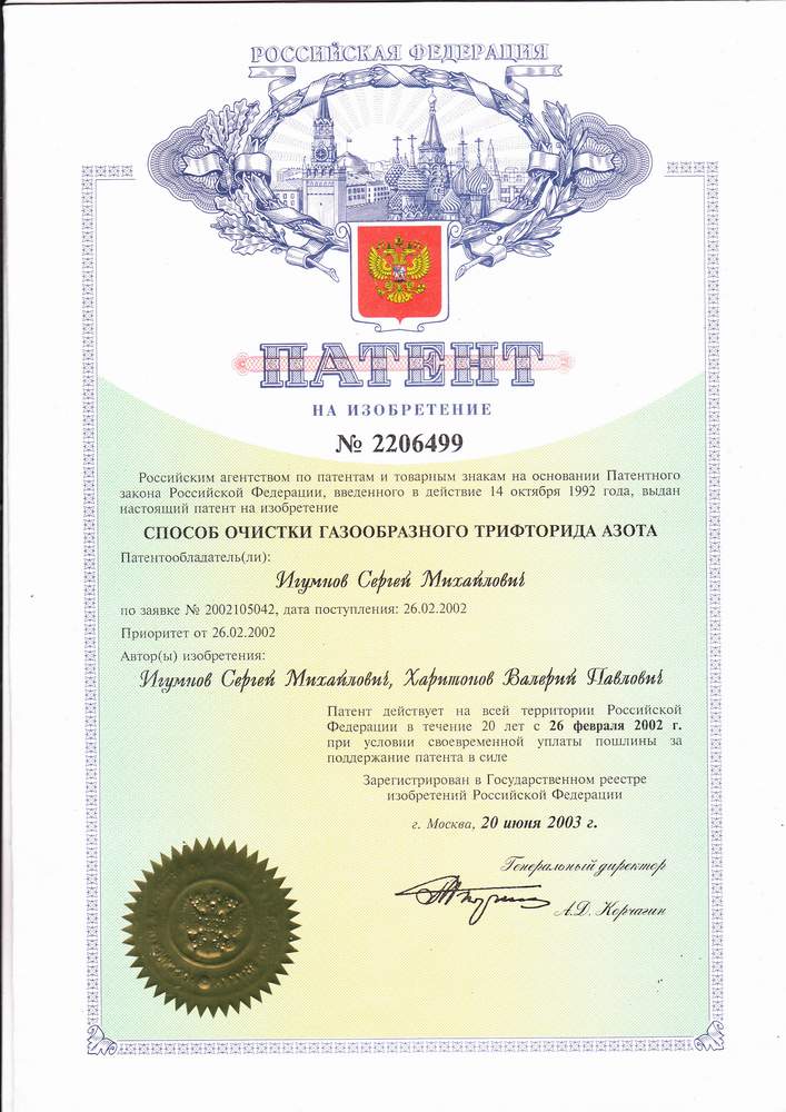 GASEOUS NITROGEN TRIFLUORIDE PURIFICATION METHOD Gaseous nitrogen trifluoride is freed of carbon tetrachloride impurities via selective adsorption of the former by dehydrated erionite at temperature between -30 and 30 C followed by displacement of carbon tetrachloride with inert gas, desorption and condensation of thus purified nitrogen trifluoride. Purity of product is 99.99% and content of CF4 is no higher than 10 ppm. EFFECT: enhanced economical efficiency and achieved easy industrial realization. Also published as EP1338558 (A2) EP1338558 (A3) US2003221556 (A1) US7022160 (B2) JP2003286013 (A) CN1459323 (A) CN1268412 (C) |