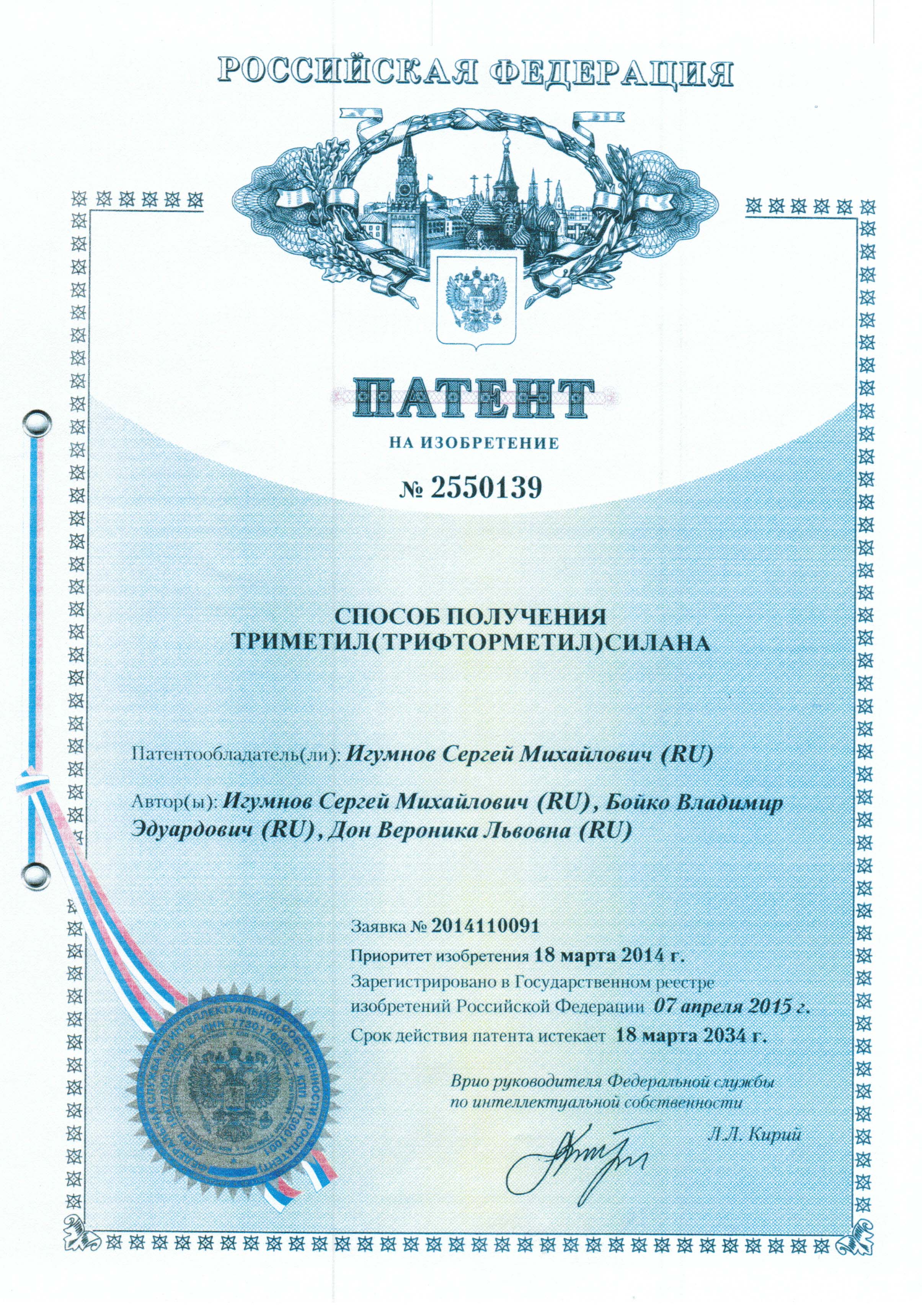 RU2550139 (C1) 2015-05-10 METHOD FOR PRODUCING TRIMETHYL(TRIFLUOROMETHYL)SILANE What is presented is producing trimethyl(trifluoromethyl)silane by a reaction of trimethyl(trichloromethyl)silane with a fluorinating agent specified in: bromine activated antimony trifluoride, or antimony pentachloride activated antimony trifluoride, or gaseous hydrogen fluoride in the presence of antimony pentachloride; the reaction is carried out at heating in an inert fluorinated solvent, such as n-chlorbenzotrifluoride, or solvent-free.EFFECT: possibility to produce the high-yield compound with using no ozone-damaging freon gases and complex instrumentation. |