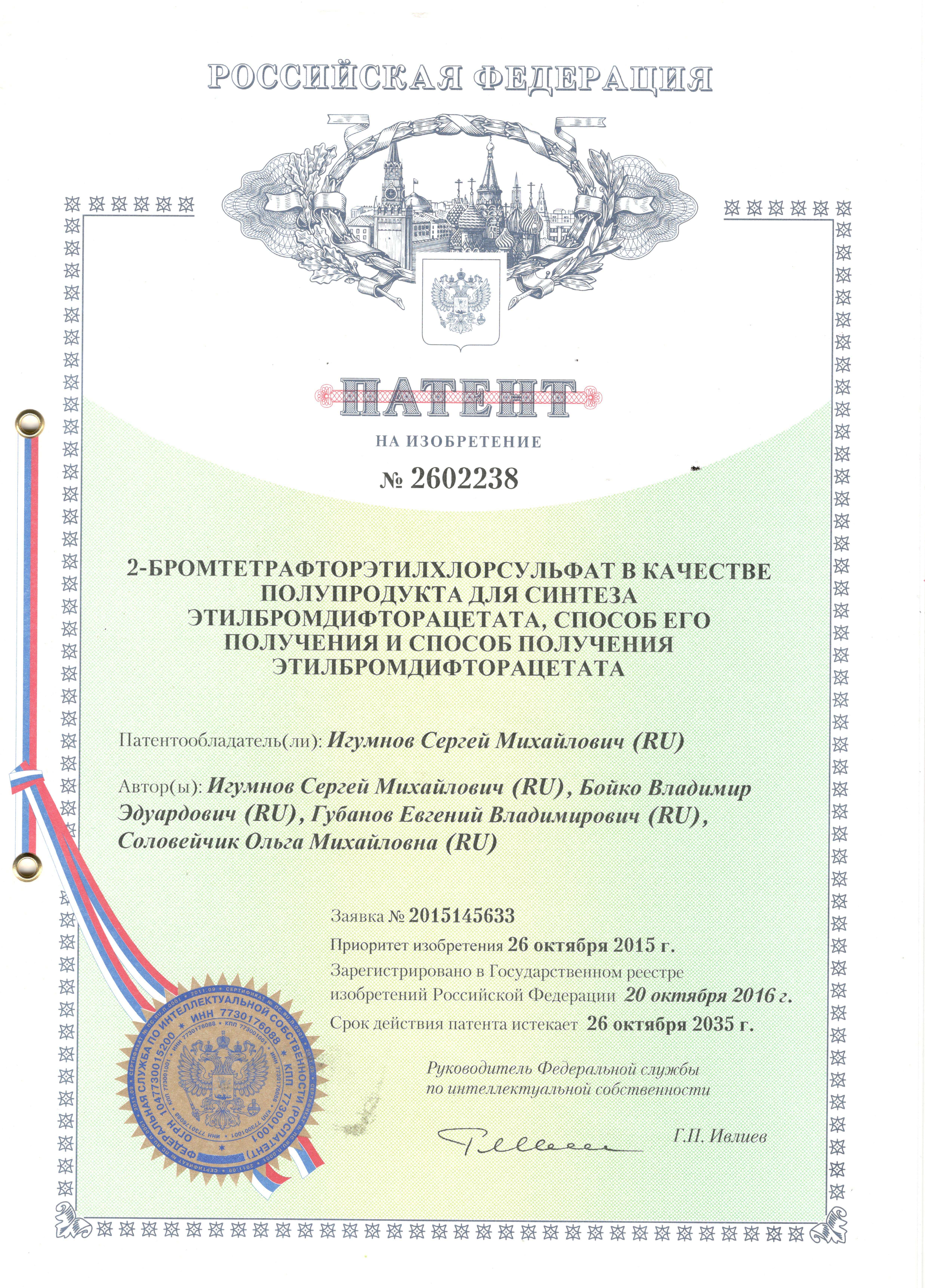 RU2602238 (C1) 2016-11-10 2-BROMOTETRAFLUOROETHYL CHLORINE SULFATE AS SEMI-FINISHED PRODUCT FOR SYNTHESIS OF BROMOETHYLDIFLUOROACETATE, METHOD OF ITS PRODUCTION AND METHOD OF PRODUCING BROMOETHYLDIFLUOROACETATEInvention relates to methods of producing esters of fluorinated acids, namely bromodifluoroacetic acid, in particular bromoethyldifluoroacetate. Bromoethyldifluoroacetate is important intermediate in synthesis of many pharmaceutical preparations, as well as plant protection agents. This invention proposes method of producing bromoethyldifluoroacetate, involving reaction of 2-bromotetrafluoroethyl halogen sulfate, where halogen is chlorine or fluorine, with ethyl alcohol in presence of base, while cooling; 2-bromotetrafluoroethyl chlorine sulfate as semi-finished product for producing bromoethyldifluoroacetate; as well as method of producing 2-bromotetrafluoroethyl chlorine sulfate by interaction of tetrafluoroethylene with bromine chloride, freshly prepared from bromine and chlorine, and chlorosulphonic acid, followed by its extraction from reaction mixture by vacuum distillation. EFFECT: method of producing bromodifluoroacetic acid is disclosed |